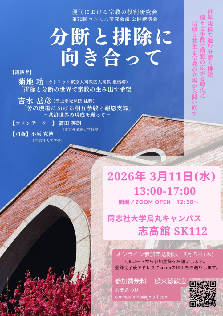 「現代における宗教の役割研究会」(通称:コルモス)の講演会をご案内いたします。